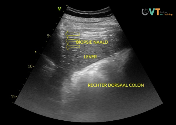 - Gezien de combinatie van leverafwijkingen en lymfadenopathie werd onder echografische begeleiding een leverbiopsie uitgevoerd.