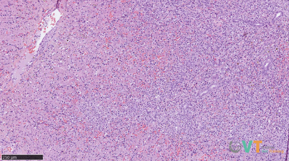 Conclusie histopathologie: Laaggradig (indolent) kleincellig lymfoom van de lever. Er kon geen definitief onderscheid worden gemaakt tussen een primair hepatisch lymfoom en een secundaire uitbreiding vanuit het maagdarmkanaal.