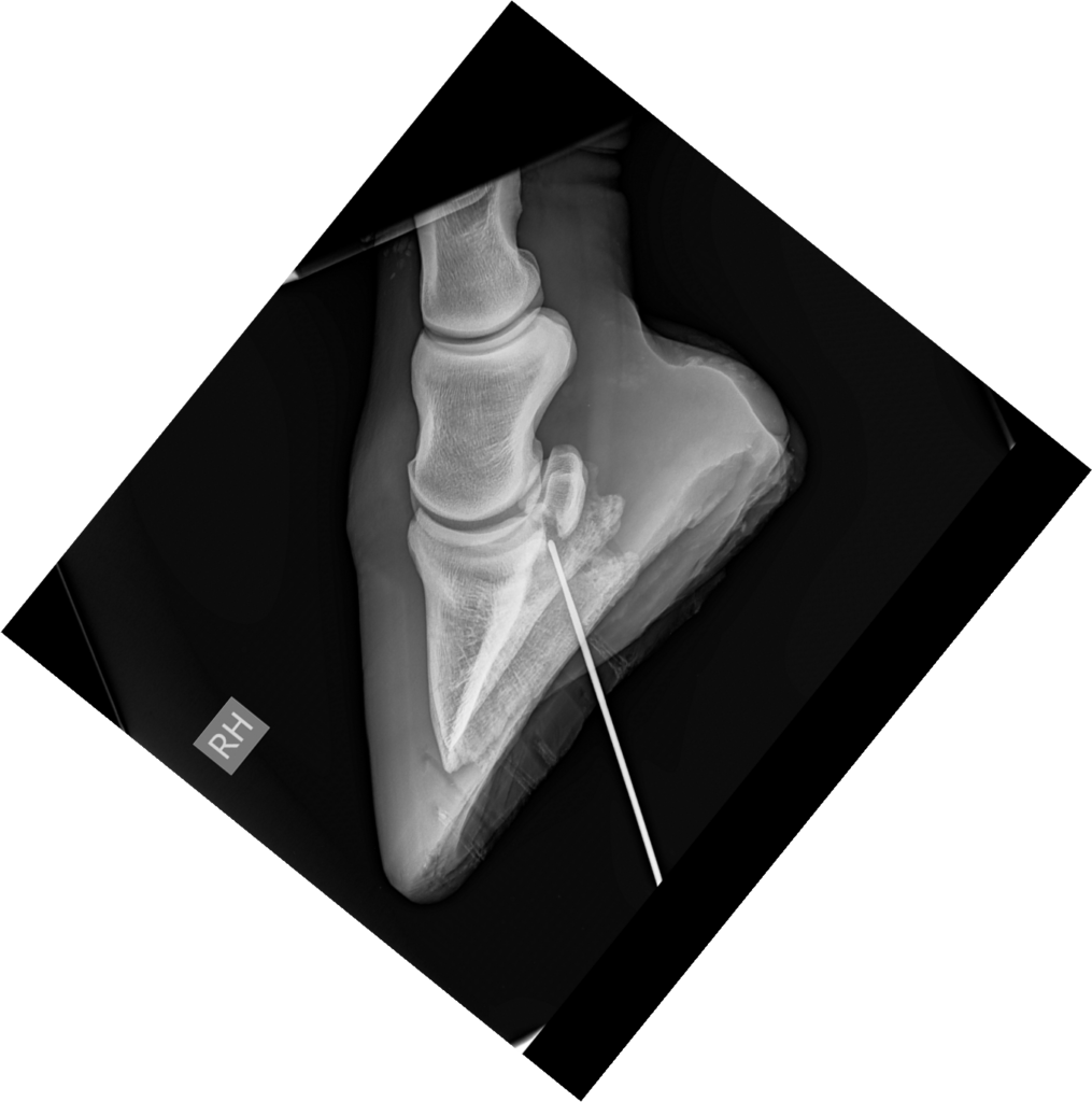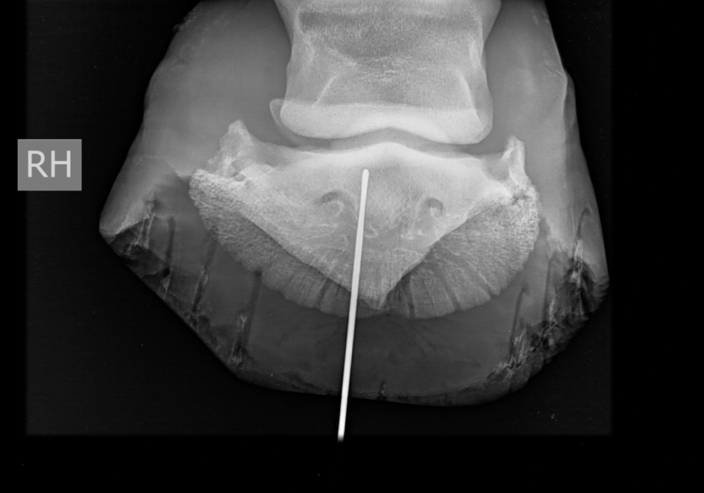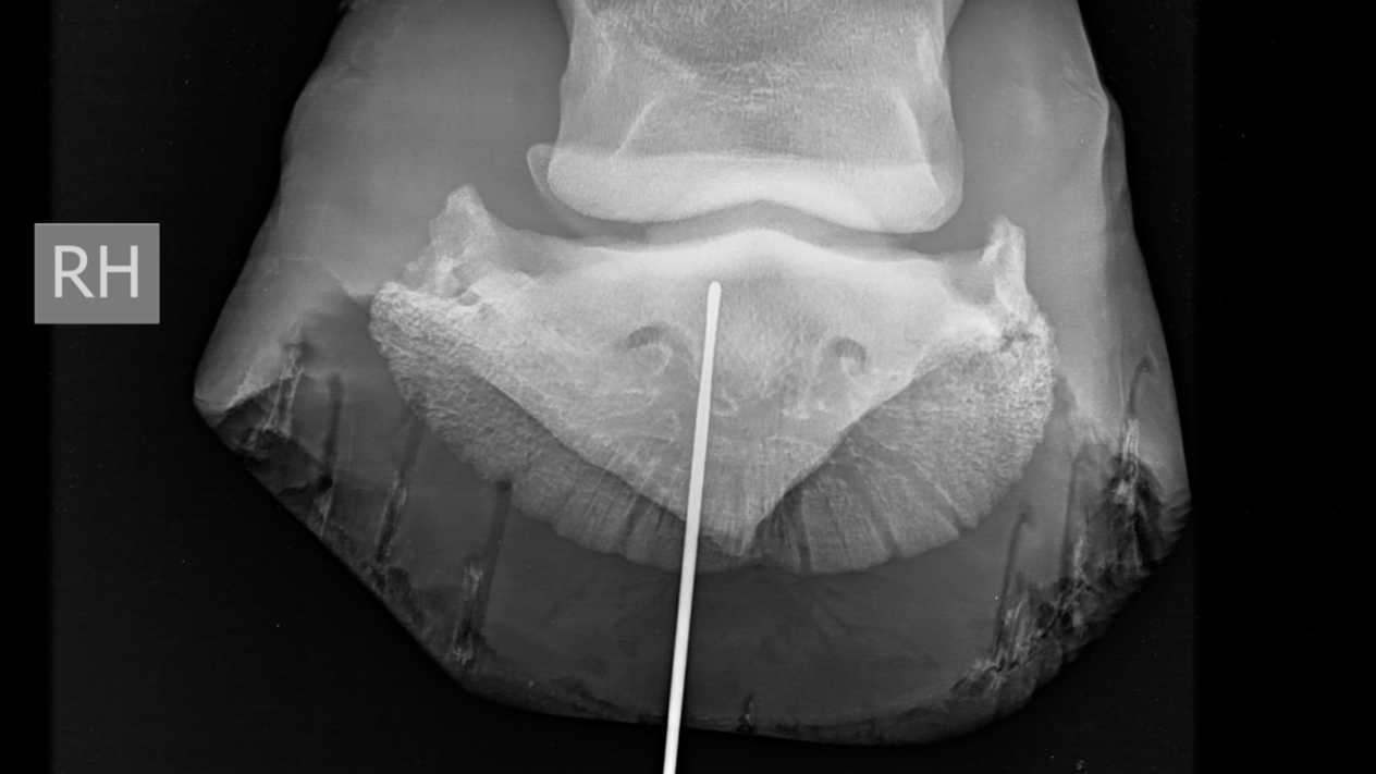De metalen sonde heeft een proximoplantaire richting en eindigt ter hoogte van het plantaroproximaal aspect van het hoefbeen en distaal van de distale rand van het straalbeen.